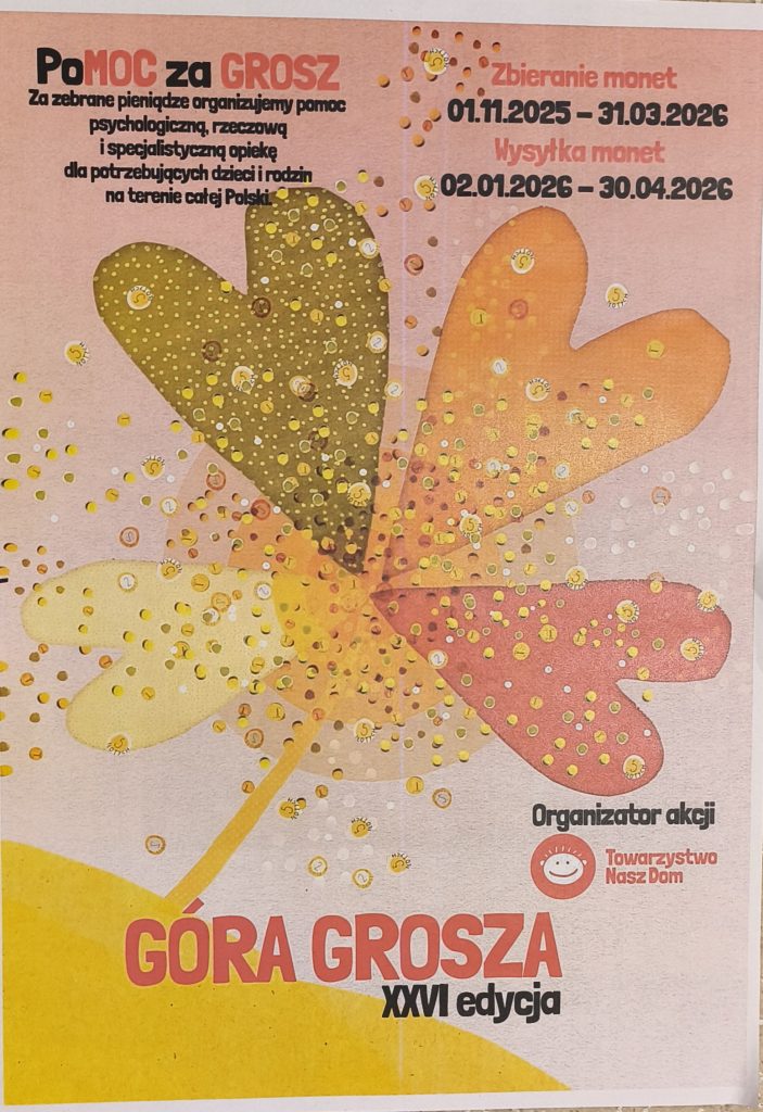 Szkolne Koło Wolontariatu zaprasza wszystkich uczniów, rodziców i pracowników do XXVI edycji Akcji GÓRA GROSZA. Głównym organizatorem akcji jest Towarzystwo Nasz Dom.